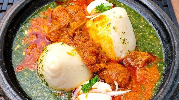 A smooth, stretchy dough made from pounded cassava and plantains (or yam/cocoyam), typically served with soups like groundnut, light, or palm nut soup.
