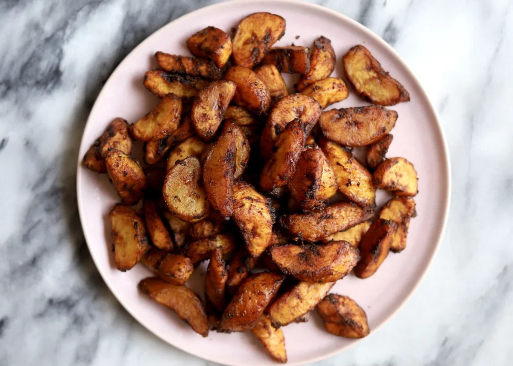 Spiced fried plantains seasoned with ginger and chili, enjoyed as a snack or side dish.