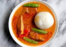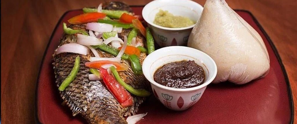 Fermented corn and cassava dough balls, typically served with grilled tilapia fish and a spicy pepper sauce or okra soup.