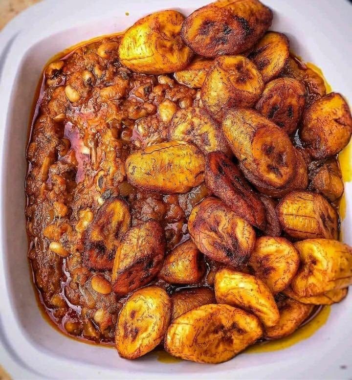 A bean and fish stew, often paired with fried plantains (dodo), characterized by the red palm oil used in its preparation.